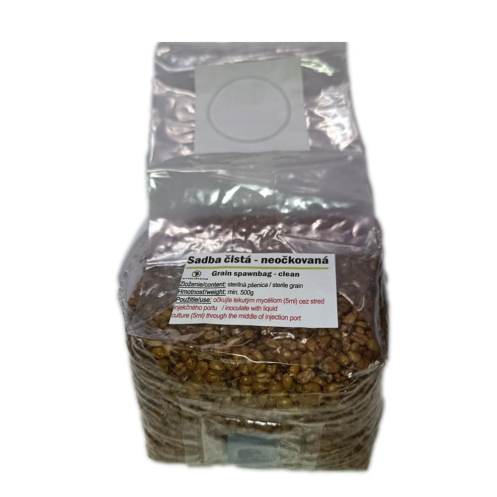 - Sadba čistá – neočkovaná 500g – neočkovaná sterilná pšenica. Sadba je v polypropylénovom sáčku so vzduchovým filtrom a injekčným portom. Žiadne dodatočné úpravy ani sterilizácia nie je nutná. Stačí zaočkovať tekutým mycéliom cez injekčný port. Pred očkovaním je nutné injekčný port dezinfikovať alkoholom. Očkujte v čistom prostredí, a dodržujte maximálnu hygienu a čistotu.